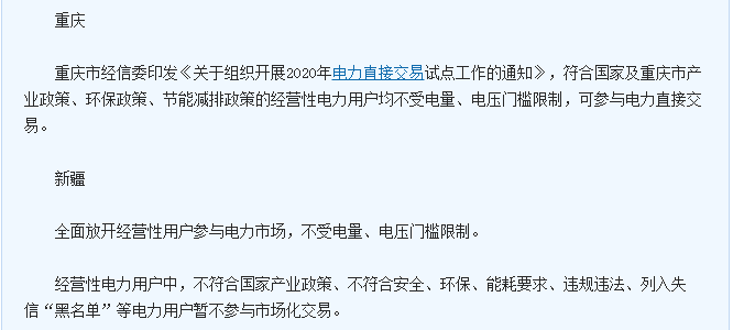 雖然還有一些省市對于明年電力市場的準(zhǔn)入要求至今未公布,但是根據(jù)上面幾個省市的情況來看,門檻還是有的,有些方面該嚴(yán)格要求的,依舊未放松。